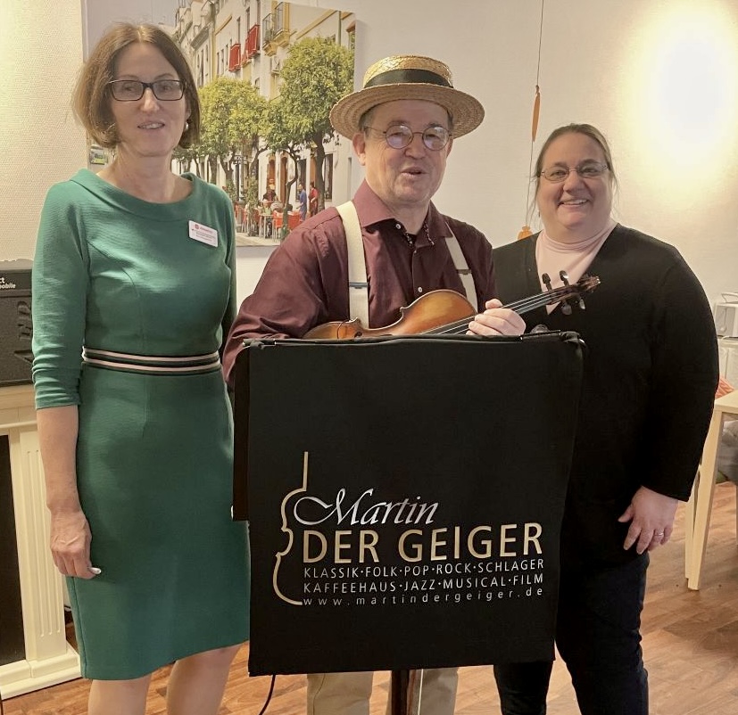 Martin der Geiger hatte einen bunten Melodienreigen mitgebracht. Passend zum herbstlichen Thema begann der „offizielle Teil“ mit „Bunt sind schon die Wälder“. Es folgten in munterer Folge schöne Melodien wie Barkarole (aus‚ Hoffmanns Erzählungen), der Gefangenenchor (aus „Nabucco“) und „Ich hätt getanzt heut Nacht“ (aus „My Fair Lady“). Fast als wäre der Opernchor anwesend wurde dazu auch mitgesungen oder gesummt.